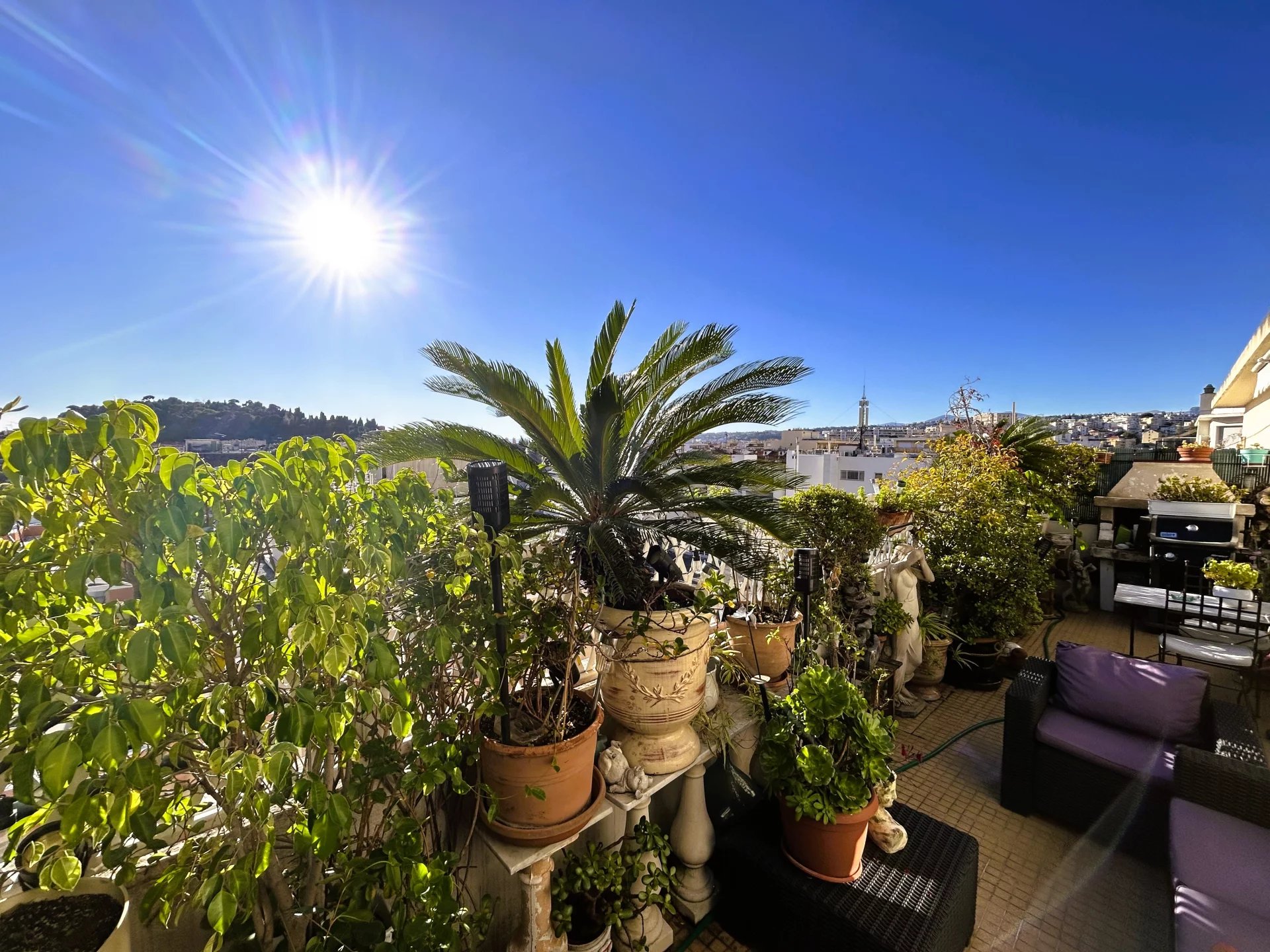 Unobstructed and quiet, this bright, dual-aspect apartment boasts a splendid 26 m² south-facing terrace, completely open to the sky, offering panoramic views over the city rooftops and the hills of Nice.